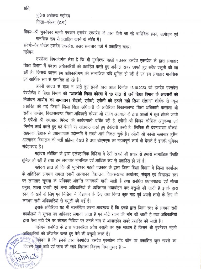 कोरबा / शिकायत पत्र के अनुसार बात की जाए तो शिकायतकर्ताओं ने पत्र में लिखा है कि भुवनेश्वर महतो पत्रकार हसदेव एक्सप्रेस के द्वारा लगातार शिक्षा विभाग में पदस्थ अधिकारियों को प्रताड़ित करते हुए अर्नगल खबर छापते हुए अवैध वसूली की जा रही है। जिसके कारण हम अधिकारीगण की सामाजिक छवि धुमिल हो रही है एवं हम लगातार मानसिक एवं आर्थिक रूप से प्रताड़ित हो रहे है।