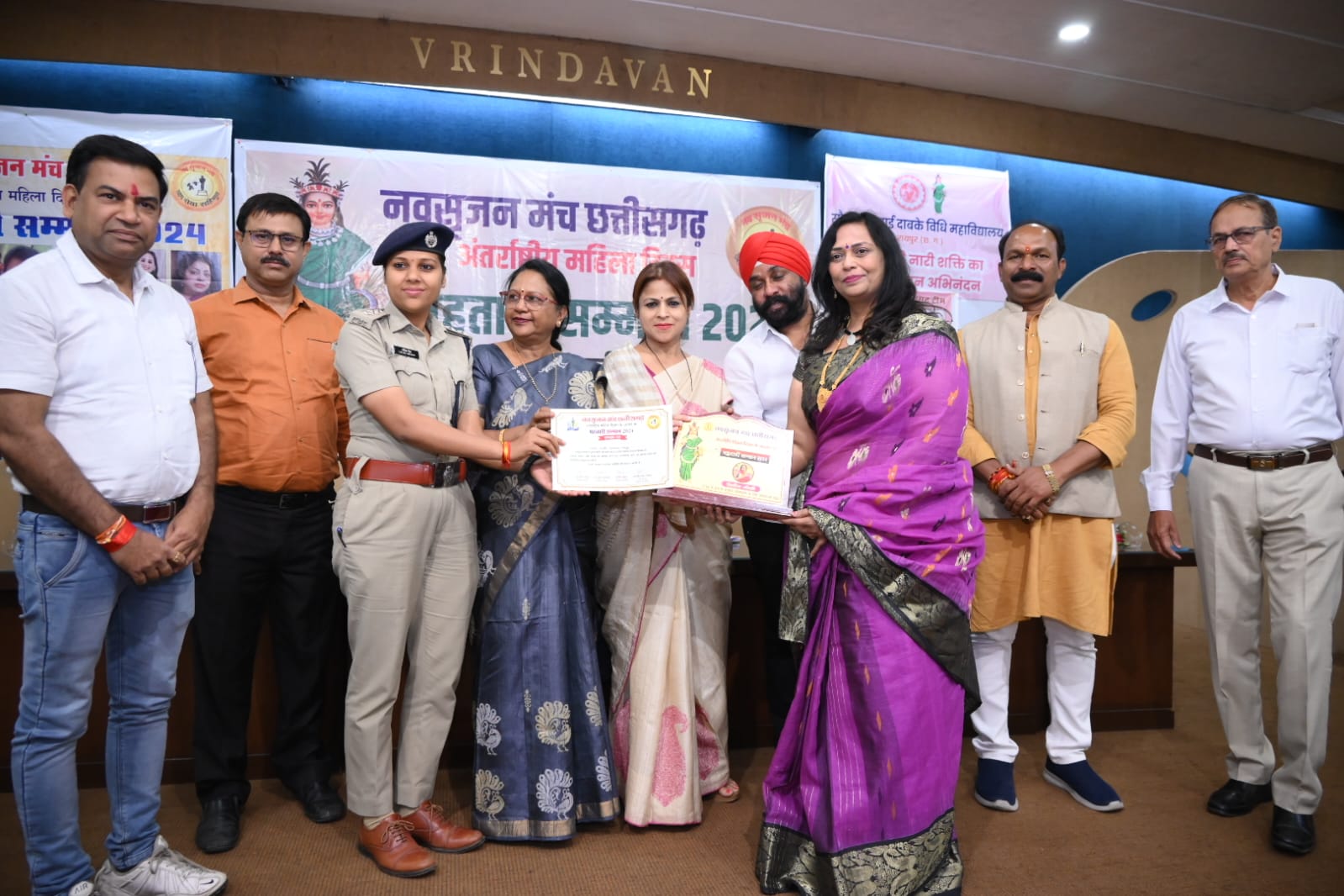 हमे आरंभ में ही इन चीजों को समझते हुए उस पर रोक लगाने विरोध करना चाहिए, कार्यक्रम में विशिष्ठ अतिथि डी एस पी ललिता मेहर ने भी सामाजिक राजनैतिक व्यवसायिक एकेडमिक व अन्य क्षेत्र में हमारा आचरण व्यवहार आदर्श हो इस दिशा में कार्य करते रहना चाहिए, किरण गजपाल प्राचार्य डिग्री गर्ल्स कालेज, जाकिर खान कुसुम ताई दाबके ला कालेज ने भी इस अवसर पर अपने विचार रखे विविध क्षेत्रों में कार्य करने वाली 40 महिलाओ क्रमशः शिरीन जोशी.आरती जेठानी, डॉ प्रीति उपाध्याय, दिव्या मिश्रा, नीतू साहू, शुभा मिश्रा, सुचित्रा बर्धन, प्रीति विकास तिवारी, डॉ पूनम संजू, डॉ तलक़ीन खान, प्रीति यादव, खुशबू श्रीवास्तव वर्मा, प्रतिभा लाल, आरती पटेल, प्रियाजैन(बनारस), प्रज्ञा त्रिवेदी, ज्योत्स्ना मिश्रा, दीपा मेश्राम, गार्गी पांडेय, डॉ आरती साठे, प्रीति मिश्रा, संध्या तिवारी, संध्या बड़ोले, विनीता वर्मा, शेफाली सोनी, प्रीति जायसवाल,नीलम कौर,डिंपल अग्रवाल,पूनम सिंह,सारिका श्रीवास्तव,फमेश्वरी सिन्हा,डॉ स्नेहा गोलछा,श्रीमती ऊषा सिंग,रचना नितेश, तरुणा साहू, आस्था चौहान,बबिता अग्रवाल प्रतिभा भरद्वाज, कल्पना शुक्ला, सुषमा बग्गा का सम्मान किया गया इसी तरह 12 स्व सहायता समूह रोशनी किरण महिला स्व सहायता समूह, सहयोग महिला स्व सहायता समूह, श्री गणेश महिला स्व सहायता समूह, ताज महिला स्व सहायता समूह, श्री राम महिला स्व सहायता समूह, नारी विकास महिला स्व सहायता समूह, लक्ष्मी महिला स्व सहायता समूह, ब्रम्ह बाबा महिला स्वसहायता समूह, जय माँ वैभव लक्ष्मी महिला स्व सहायता समूह, आरती महिला स्व सहायता समूह, अन्नपूर्णा स्व सहायता समूह, संचय महिला स्व सहायता समूह का सम्मान, महातरी गौरव देकर सम्मानित किया गया सम्मान में रुपिया माला, मोहरी पहनाकर सम्मान किया गया जो चर्चा का विषय रहा महिलाएं मोहरी रुपिया माला से सम्मान पाकर प्रफुल्लित नजर आई,सामाजिक संस्था नवसृजन मंच के इस आयोजन को लेकर प्रदेश भर से प्रविष्ठियां मंगाई गई थी, कार्यक्रम का संचालन डा प्रीति सतपथी और आभार डा देवाशीष मुखर्जी ने किया सम्मान समारोह में किशोर महानंद, कांतिलाल जैन, डा रश्मि चावरे, मनीषा बघेल, विनय शर्मा, मनोज जैन सहित प्रमुख पदाधिकारीगण उपस्थित थे नवसृजन मंच आयोजन की तैयारी को लेकर डा प्रीति सतपथी, डा रश्मि चावरे, मनीषा बघेल, नव सृजन मंच के संयोजक डा देवाशीष मुखर्जी, किशोर महानंद, मनोज जैन अनुपमा त्रिपाठी उपस्थित थे