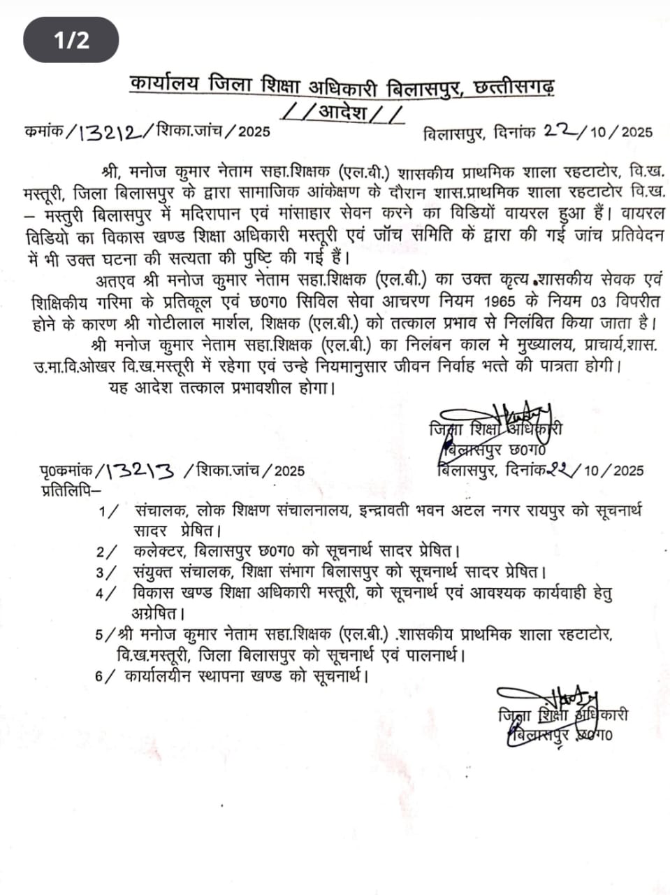 शिकायत पर त्वरित कार्रवाई करते हुए जिला शिक्षा अधिकारी कार्यालय ने दोनों शिक्षकों को तत्काल निलंबित कर दिया है। अधिकारियों ने बताया कि यह आचरण शिक्षक सेवा नियमों के पूर्णतः विरुद्ध है और शिक्षा व्यवस्था की साख को धूमिल करने वाला है।