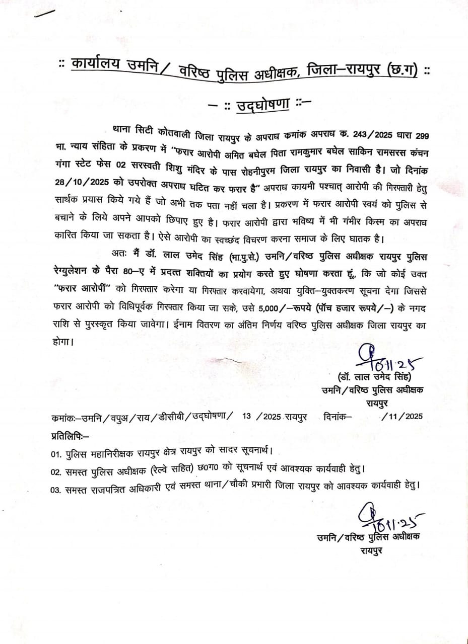 रायपुर। राजधानी पुलिस ने विवादित टिप्पणी मामले में आरोपी अमित बघेल को भगोड़ा घोषित कर दिया है। पुलिस ने उसकी गिरफ्तारी पर 5,000 रुपए का इनाम घोषित किया है।