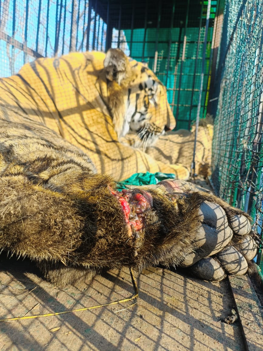 00 बाघ घायल पैर पर पूरा वजन डाल पा रहा है और पंजे की पकड़ सामान्य है।