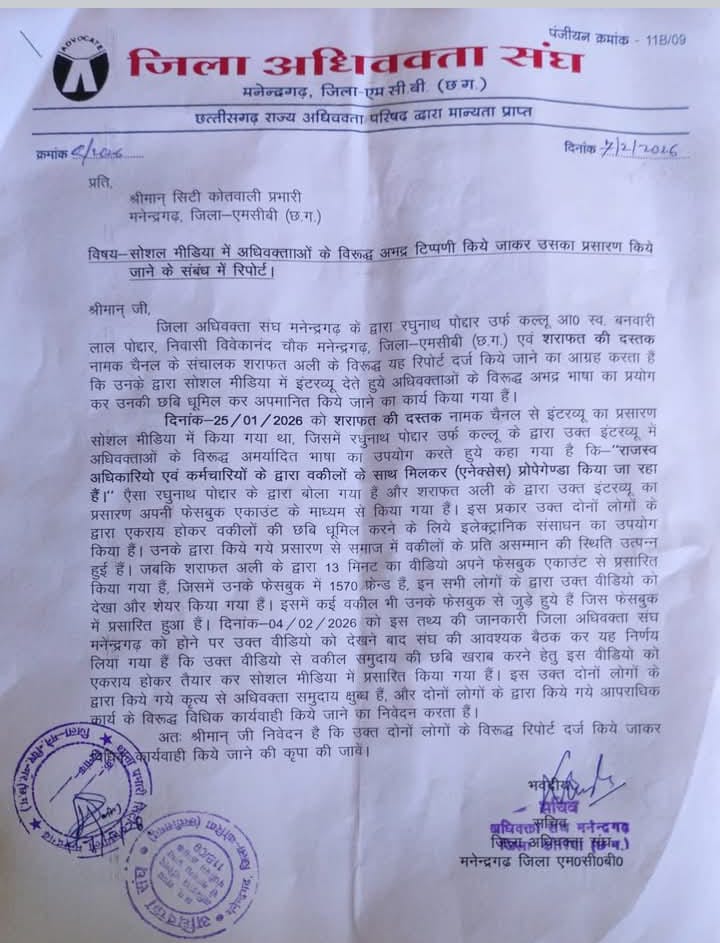 मनेन्द्रगढ़। सोशल मीडिया के माध्यम से अधिवक्ताओं के विरुद्ध अभद्र और अपमानजनक टिप्पणी प्रसारित किये जाने के मामले को लेकर जिला अधिवक्ता संघ मनेन्द्रगढ़ ने सिटी कोतवाली प्रभारी को ज्ञापन सौंपकर संबंधित व्यक्तियों के विरुद्ध अपराध दर्ज कर कार्यवाही की मांग की है।